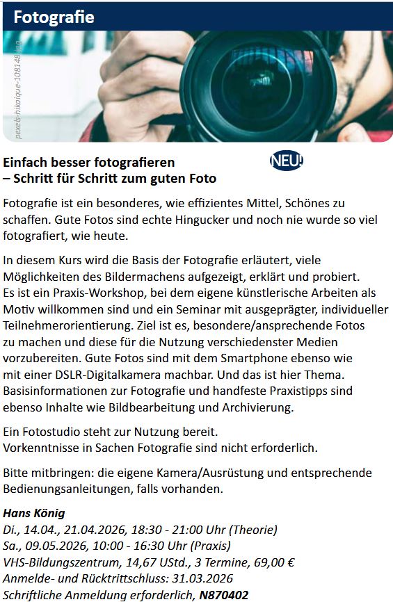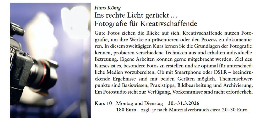Bei der KVHS Aurich Norden (Standort Norden) die Seminare „Einfach besser fotografieren…“ sowie die Schreibwerkstatt „Die richtigen Worte…“