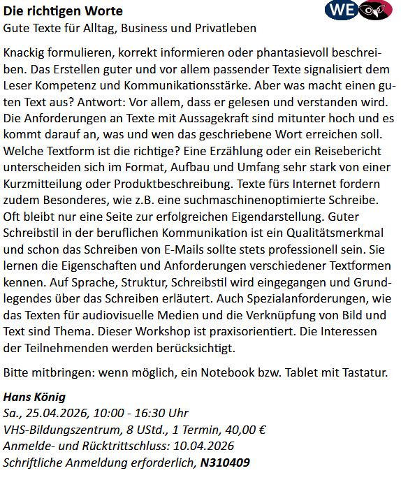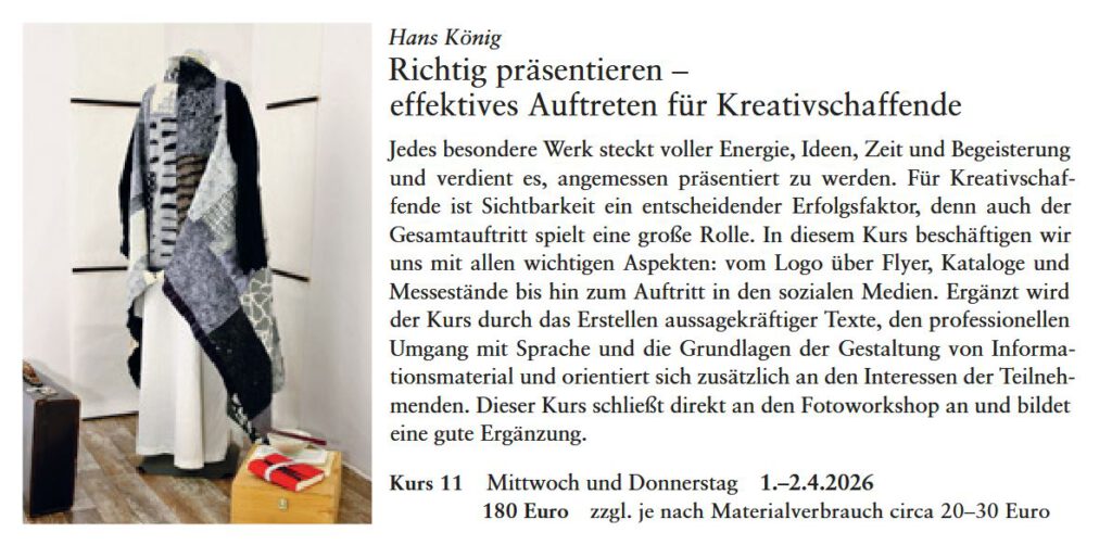 Die folgenden Workshops/Seminare finden im Frühjahr 2026 statt. Bei Wollknoll im schwäbischen Oberrot die Kurse „Ins rechte Licht gerückt..“ und „Richtig präsentieren…“
